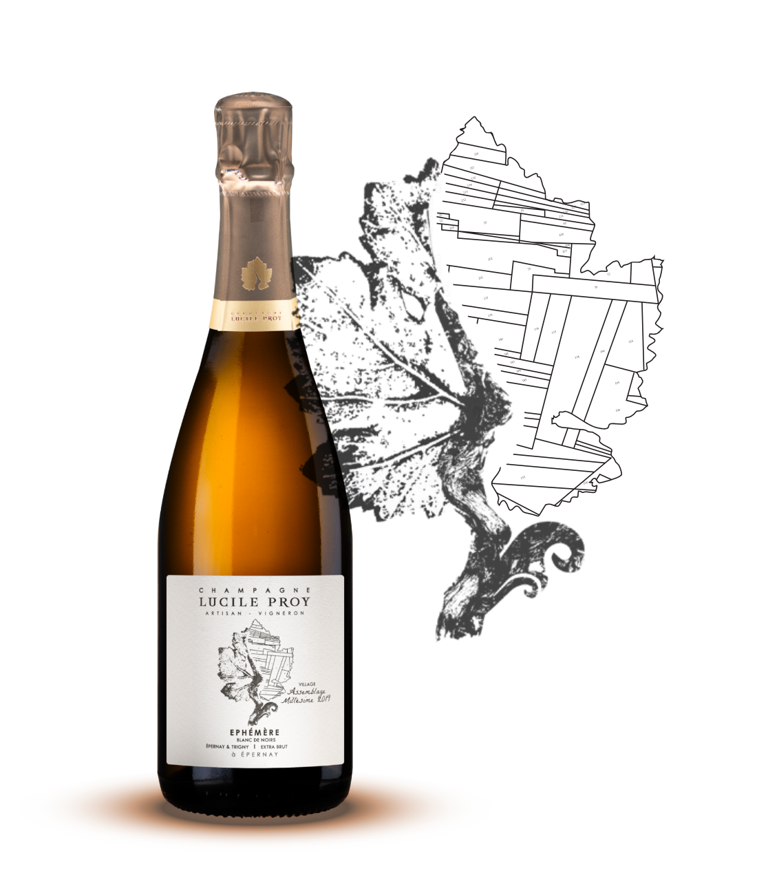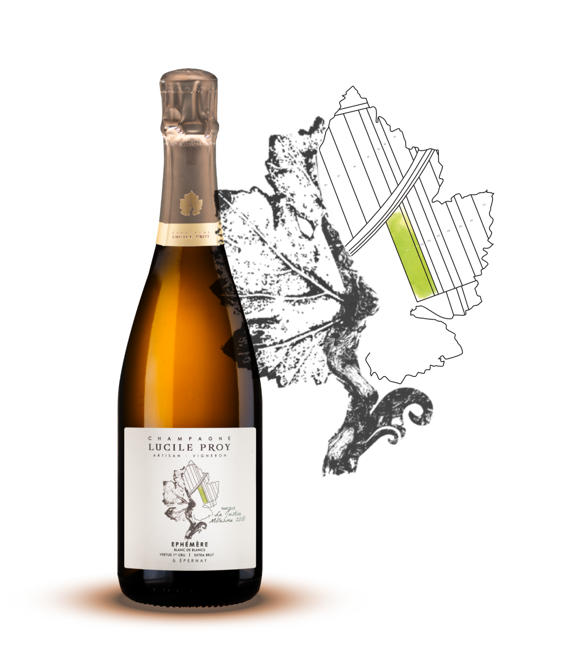 Sur l’étiquette, la feuille signature de la maison est ornée d’un plan cadastral de Vertus, où la parcelle La Justice est mise en lumière. Un hommage graphique à la terre d’origine, figée dans le temps, le temps d’un millésime.